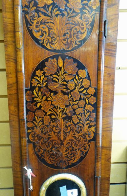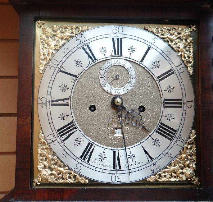A LATE 17TH CENTURY WALNUT MARQUETRY LONGCASE CLOCK with eight day movement (restored and cleaned / possibly later), the hood with overhanging cornice to twisted columns, the 29cms brass dial with silvered chapter ring bearing Roman numerals, seconds subsidiary dial and date aperture within engraved border, cherubic and foliate spangrels, the dial inscribed Thomas Martin, London the case with four marquetry panels with urns of flowers and perched birds, 203cms high