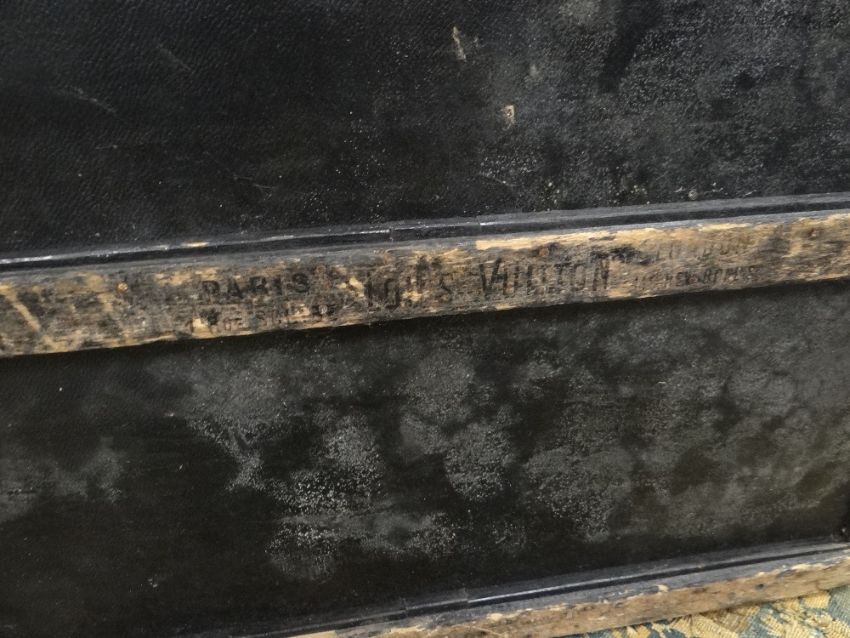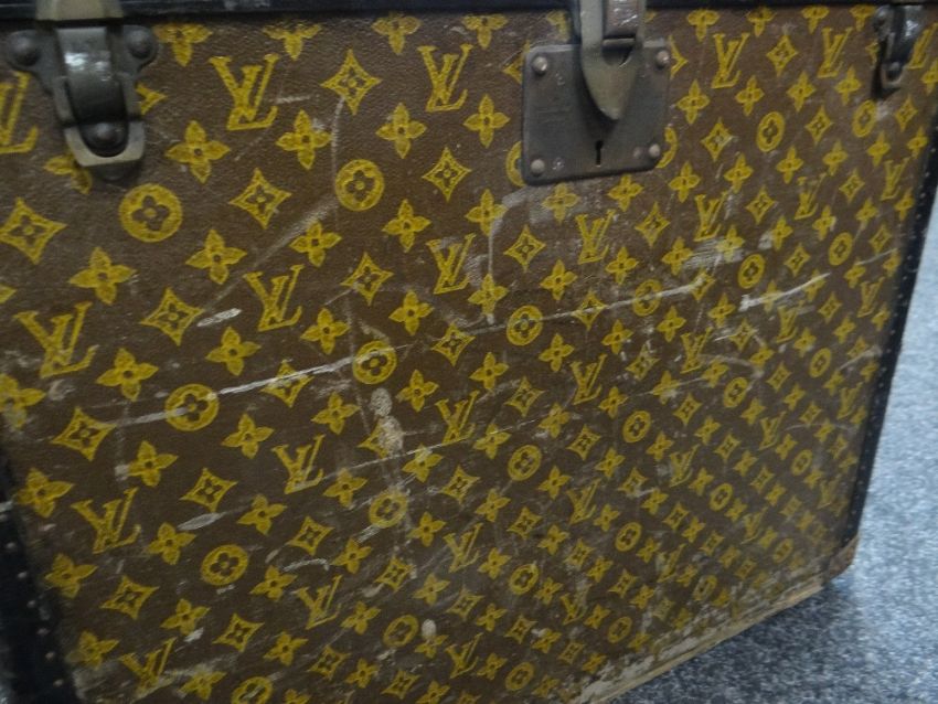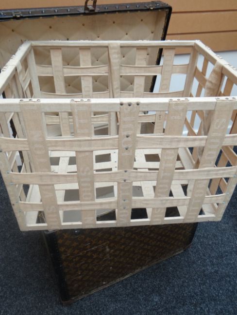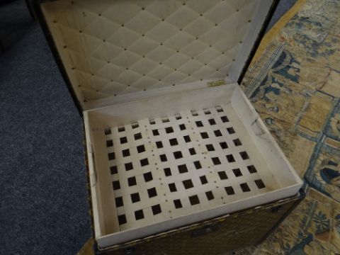 A LOUIS VUITTON ANTIQUE STEAMER TRUNK late 19th early 20th century, serial number 183907, bears label to the interior and with " lift out " canvas - lattice self. The exterior typically decorated with motif and monograms, wooden banding leatherwork, Louis Vuitton clasp and iron work handles. 60 cms wide x 47 cms deep x 54 cms highThe outside of the case has general wear, there are lots of scuffs and scratches, there are also red numbers and letters painted on the sides and top. There is no major damage, no breaks or tears and it is structurally solid.The latches are all good, starting to rust but again nice and sturdy and work well.The inside looks complete, all the fabric is present, there are no rips or tears. Some of the fabric has started to yellow and there are a few little stains but all feels nice and solid, again cleaned up, would all look great