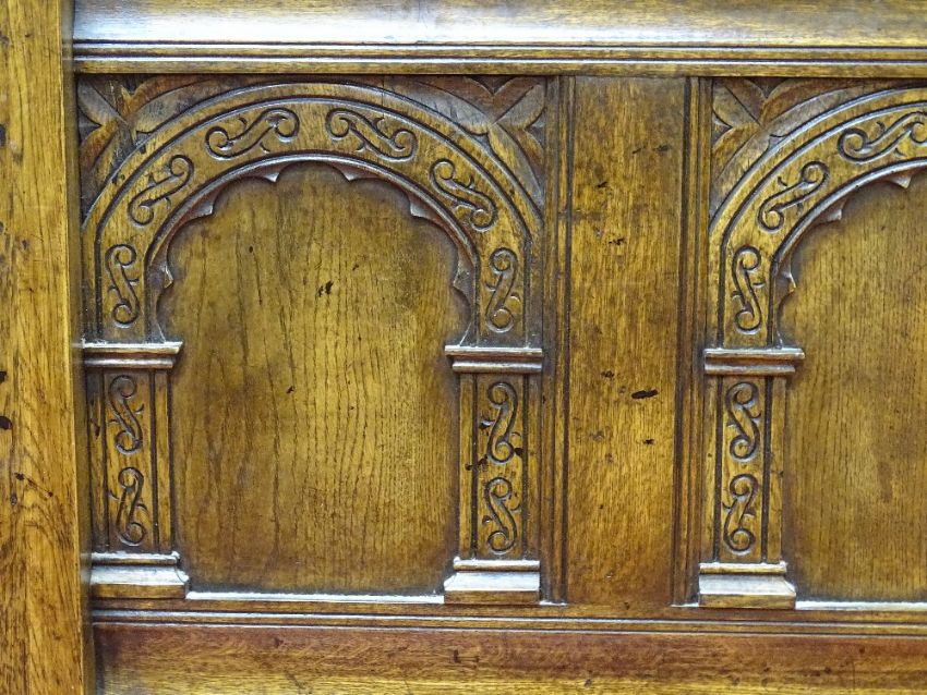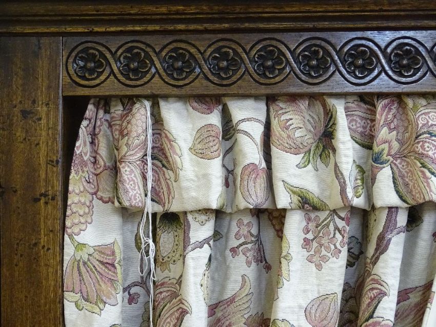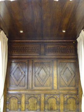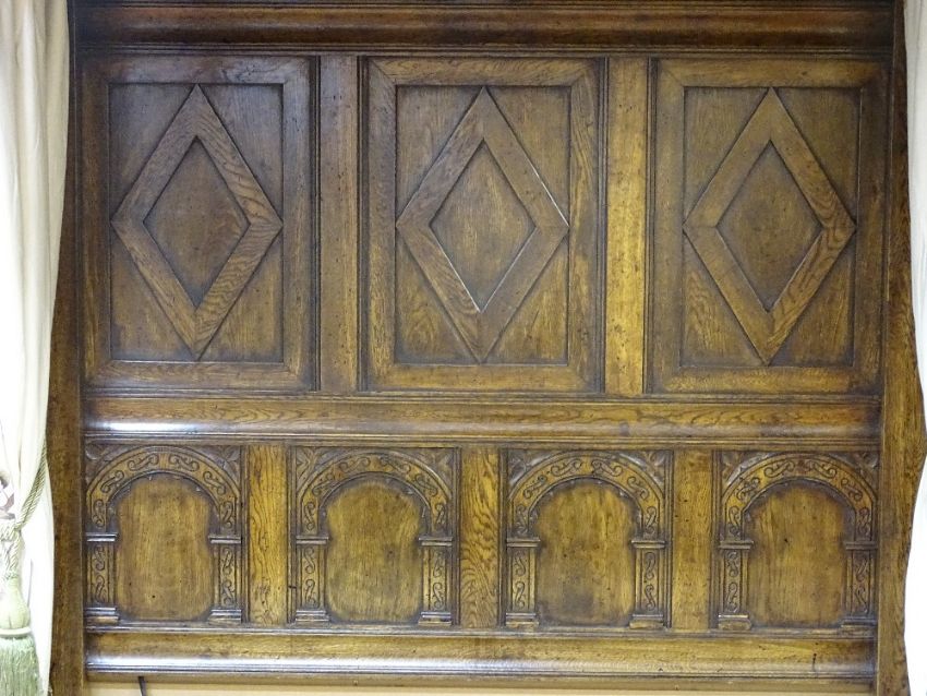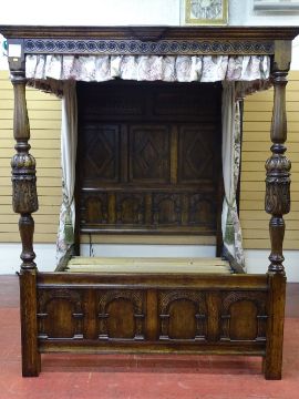 AN EXCELLENT REPRODUCTION OAK FULL TESTER BED FRAME with full height carved panel back and arched panel foot end with substantial acanthus carved pillars and planked effect full cover top with downlighters, all round frieze drapery and side curtains and bullion tassels, to fit mattress size 6 ft 6ins x 5 ft (not supplied), 213.5 cms high, 230 cms long overall, 180 cms wide maximum