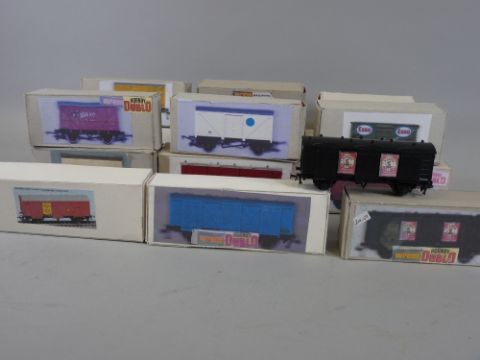MODEL RAILWAY - Wrenn/Hornby Dublo goods wagons inclusive of six passenger fruit vans, blue, maroon, Players, Navy Cut, brown (two), red, ventilated vans, Bisto, 16T mineral wagon Esso, Triang blue spot fish van, fifteen in total, all in homemade boxes