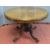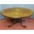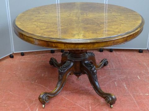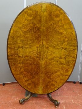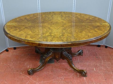 AN ANTIQUE BURR WALNUT OVAL TILT TOP BREAKFAST TABLE on bulbous support and four scrolled feet with brass castors, 150 x 113 cms