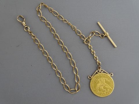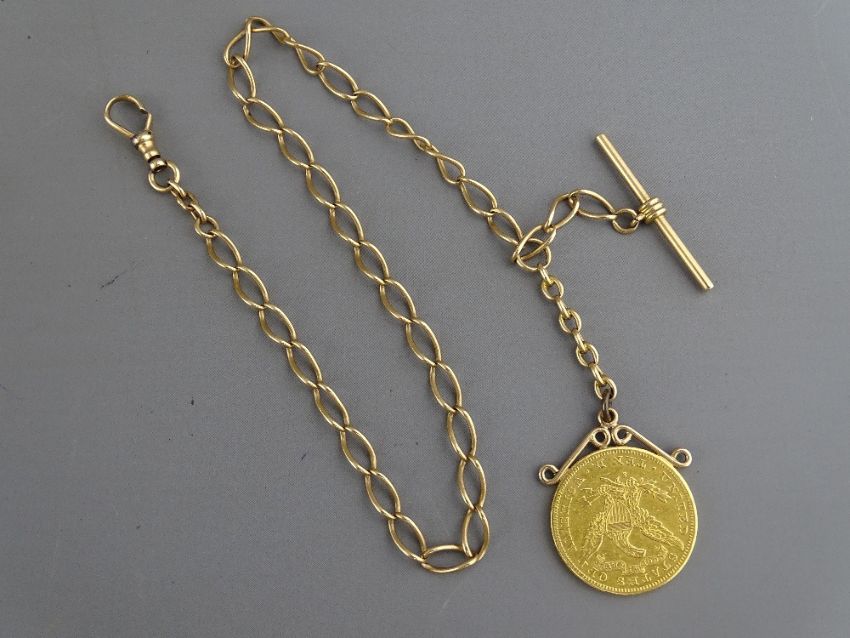 A UNITED STATES TEN DOLLAR GOLD COIN dated 1903 with attached pendant loop and unmarked yellow metal fob chain with swivel clip and T-bar, 35 cms long, 17.8 grms the mounted coin, 33 grms gross