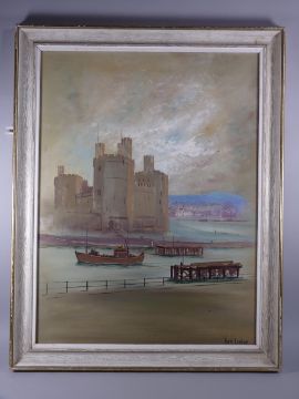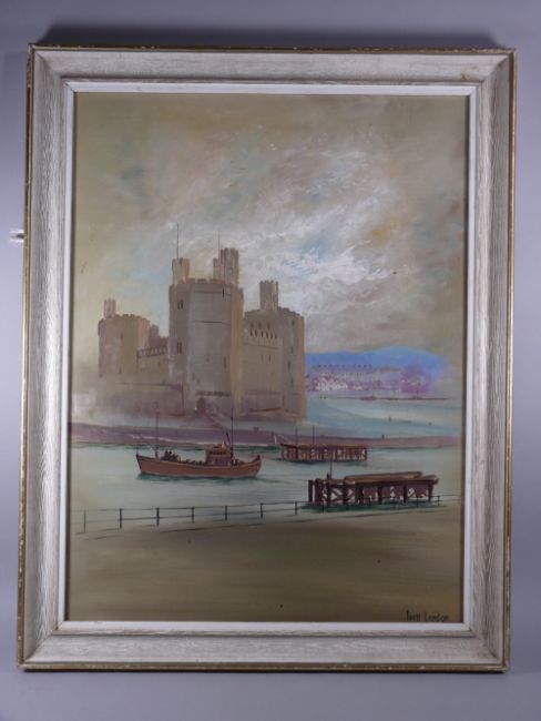 BRETT LONDON oil on board - Caernarfon Castle with trawler exiting the harbour, signed in full, 59 x 44 cms