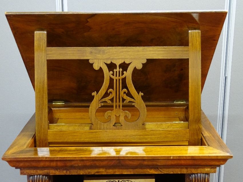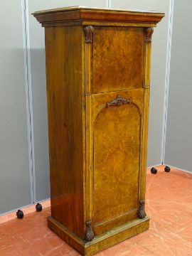 AN ANTIQUE FRENCH WALNUT ESCRITOIRE, neatly proportioned with capped column and carved panel front detail, the drop down bureau top with inlaid boxwood fronted drawers and slide-out pen and ink tray, with gilt tooled leather writing surface, single lower door with slide-out tray and shaped lower compartments, 122 cms high, 53.5 cms wide, 42.5 cms deep