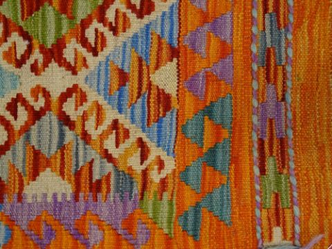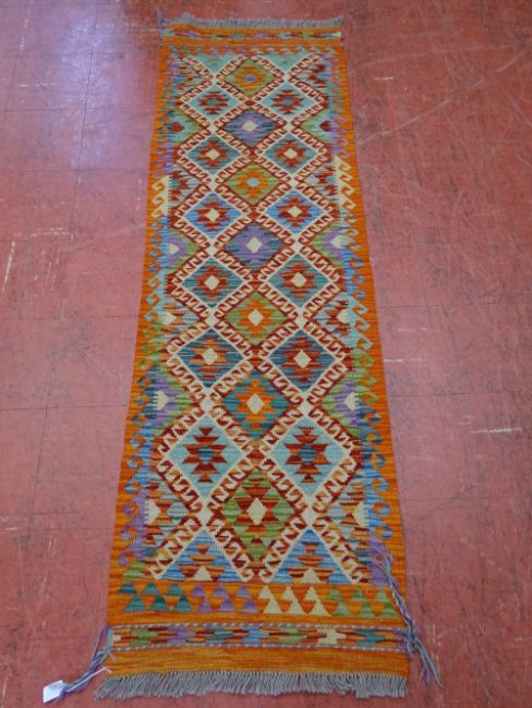 A VEGETABLE DYE WOOL CHOBI KELIM CARPET RUNNER, vibrant colours with wave border and multi-diamond central pattern, 193 x 64 cms