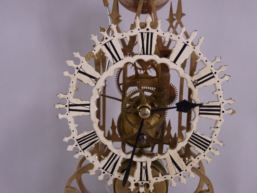 A LATE 19th CENTURY BRASS SKELETON CLOCK, single fusee bell strike movement behind a pierced white enamel dial set with black Roman numerals, with pendulum and key, on a two tier marble base with glass domed cover, 47 cms high overall complete, 28 cms wide maximum