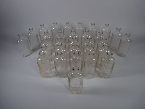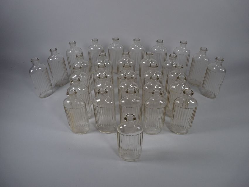 APOTHECARY BOTTLES - Thirty one clear glass ribbed bottles, 3.5 fl ozs (approximately 100 ml), 13.5 cms high