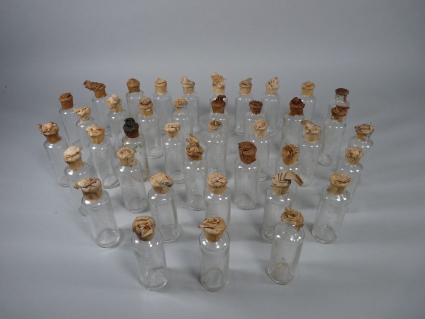 APOTHECARY BOTTLES - Forty clear glass tincture bottles marked 'Teaspoons' and with original paper seals, 9.5 cms high