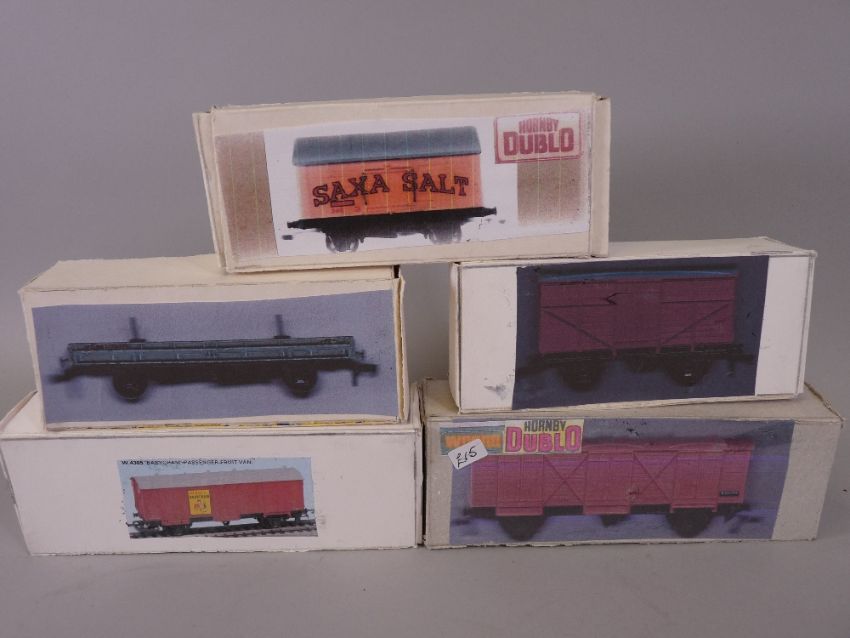 MODEL RAILWAY - Wrenn/Hornby Dublo goods wagons (fourteen) inclusive of five passenger fruit vans, Saxa & Bulk salt, grain, Youngs, Watneys, United Glass, Bolster, Triang blue spot fish van