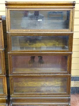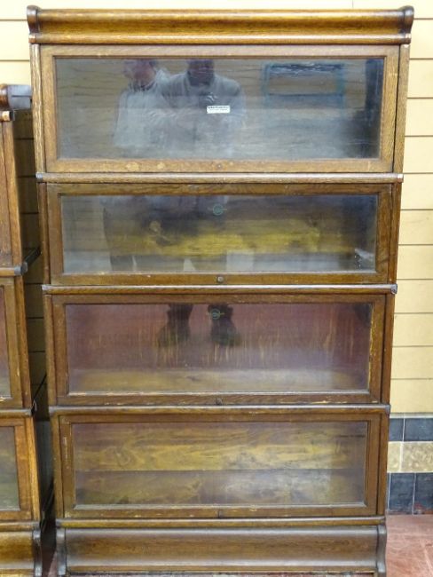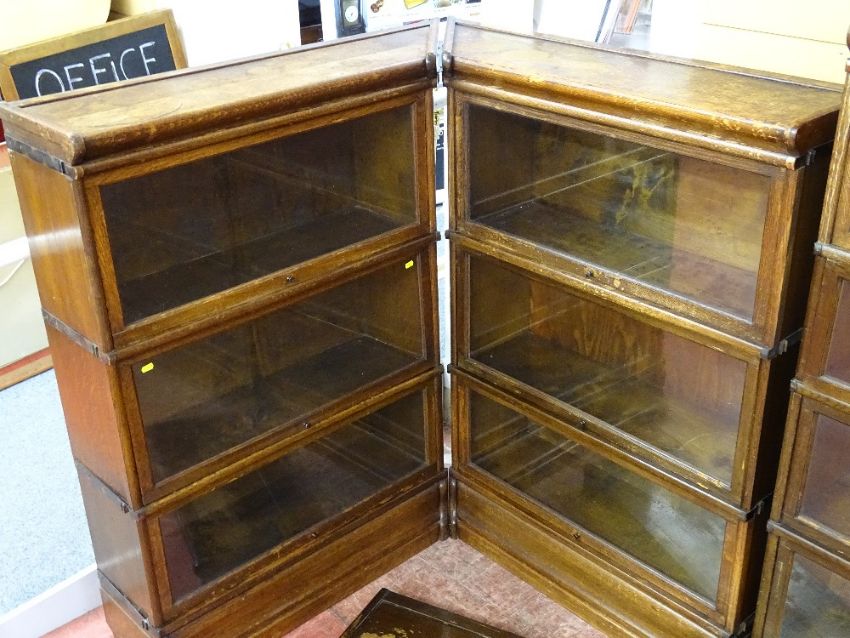A TEN SECTION GROUP OF GLOBE WERNICKE BOOKCASES including a six part corner set and a four section stand alone bookcase, 129.5 cms high the corner sections, 146 cms high the stand alone section, all 86.5 cms wide, all 28 cms deep, along with one further closed top