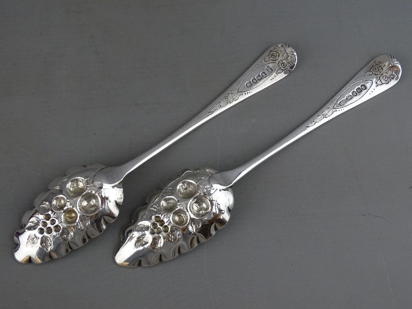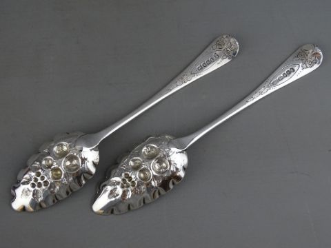 A PAIR OF GEORGE III SERVING SPOONS, London 1803 by Thomas Wallis II, the gilt bowls with berry decoration and chased handles, in a velvet lined fitted case, 4.5 troy ozs