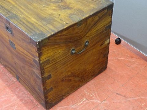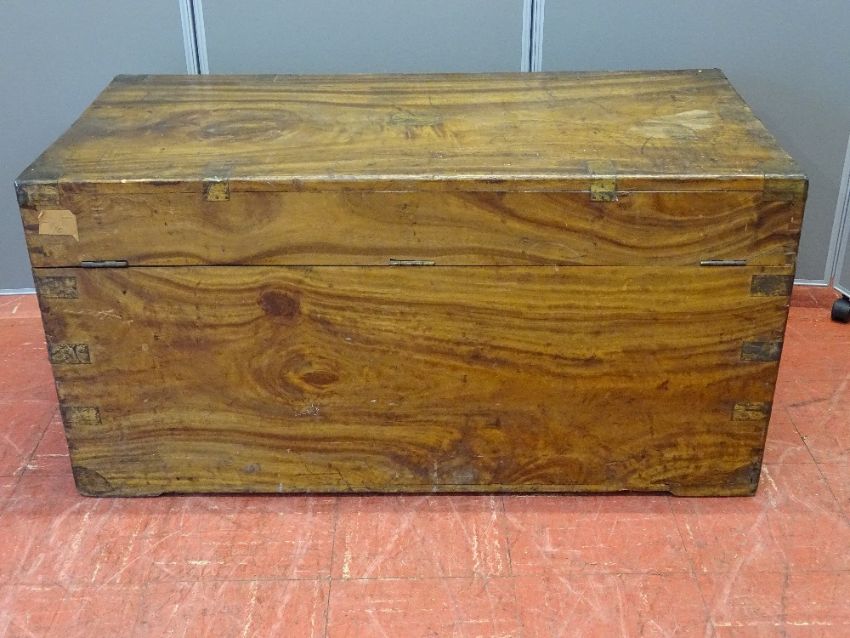 A VINTAGE CAMPHOR WOOD CHEST with brass banding and iron carry handles, 51 cms high, 103 cms wide, 51.5 cms deep