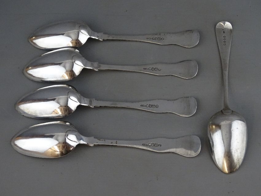 A SET OF FOUR KING'S PATTERN SILVER SERVING SPOONS, 10 troy ozs, Edinburgh 1881 and a non-matching serving spoon with crested handle, 2.2 troy ozs, London 1865