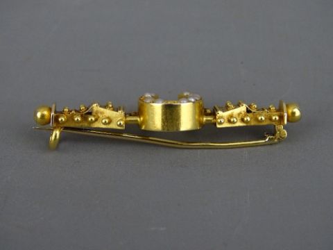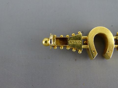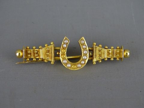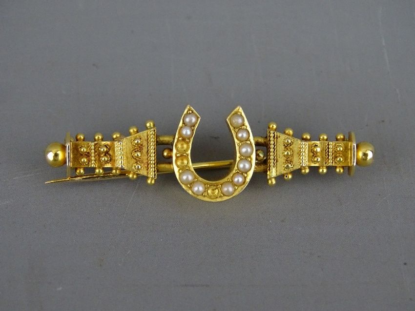 A FIFTEEN CARAT GOLD BROOCH with seed pearl encrusted horseshoe, 4 grms