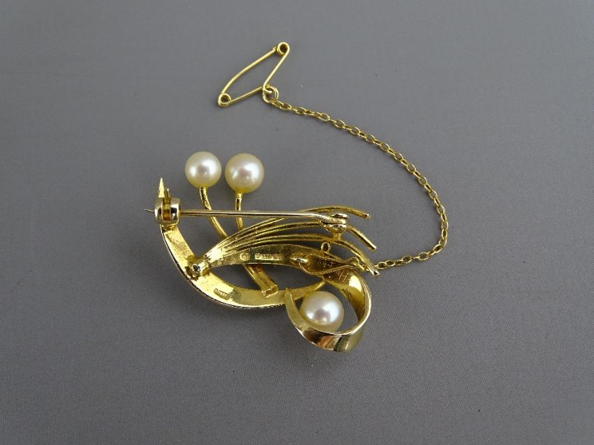 A NINE CARAT GOLD LEAF BROOCH with three pearls and safety chain, 4.9 grms
