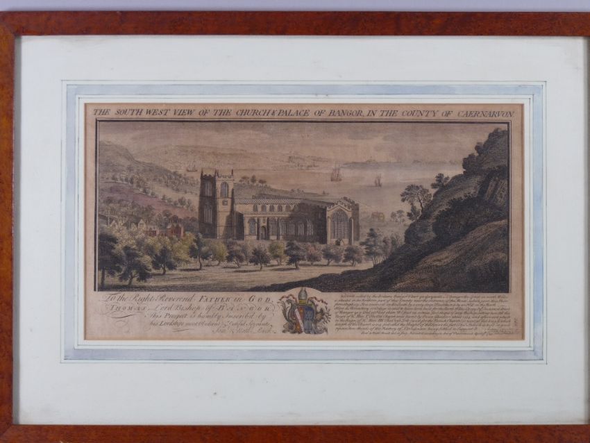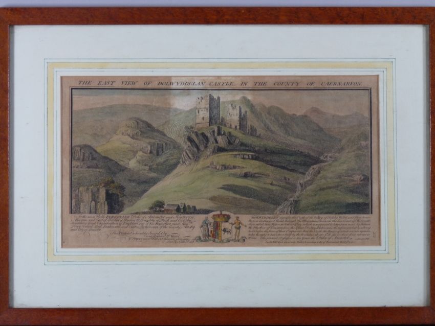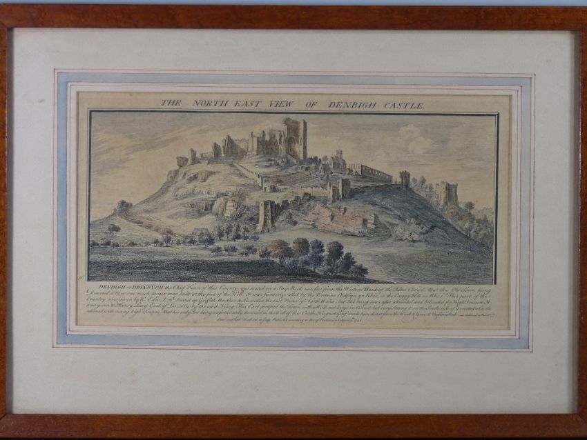 SAMUEL & NATHANIEL BUCK a set of six colour tinted historical prints of North Wales - 'Dolwyddelan Castle', 'Hawarden Castle', 'Denbigh Castle', 'Conwy Castle', 'Caergwrle Castle' and 'Bangor Cathedral', all 20 x 37 cms