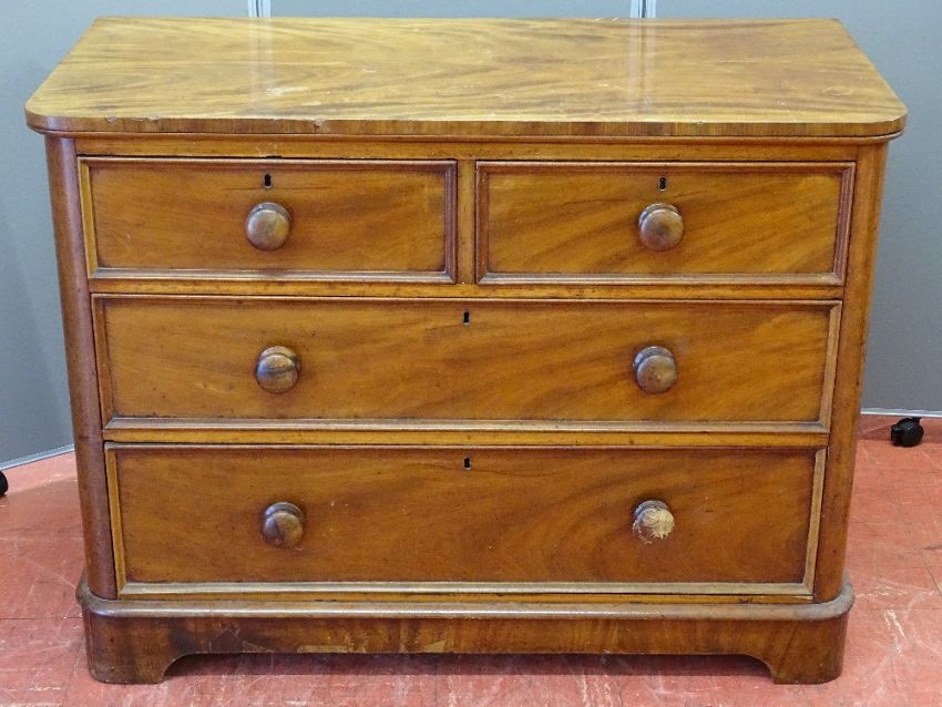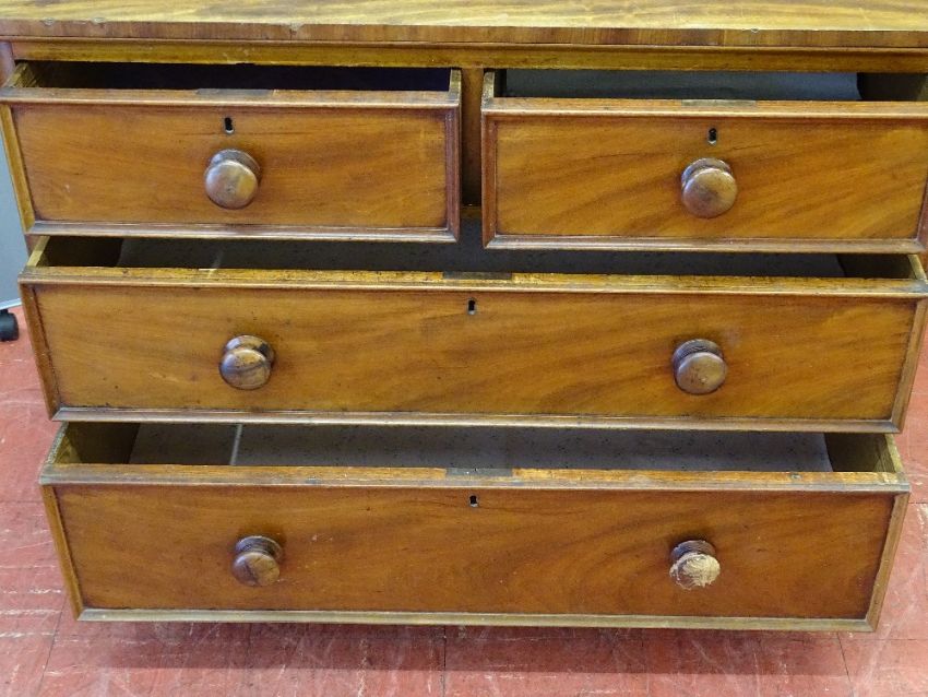 A VICTORIAN MAHOGANY CHEST OF TWO SHORT OVER TWO LONG DRAWERS with turned wooden knobs, 80.5 cms high, 106 cms wide, 50.5 cms deep