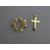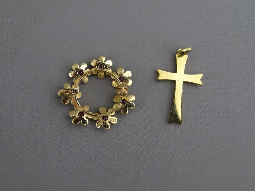 A NINE CARAT GOLD CIRCULAR LEAF BROOCH with seven rubies in floral form (pin missing), 2 grms and a nine carat gold shaped and plain crucifix, 1.2 grms