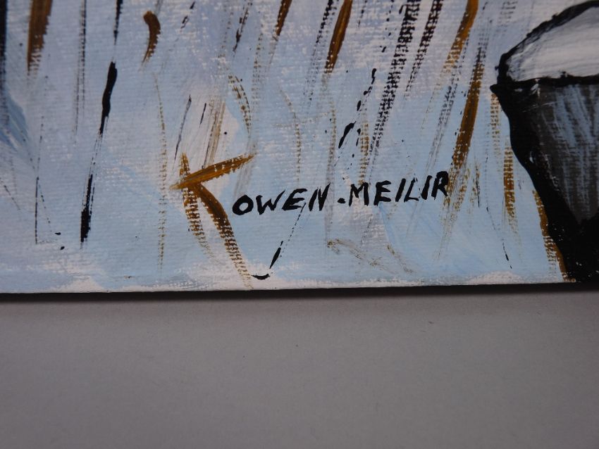 OWEN MEILIR oil on canvas on stretcher - stone wall with dwellings to the background and snow covered field to the foreground, signed, 46 x 60 cms