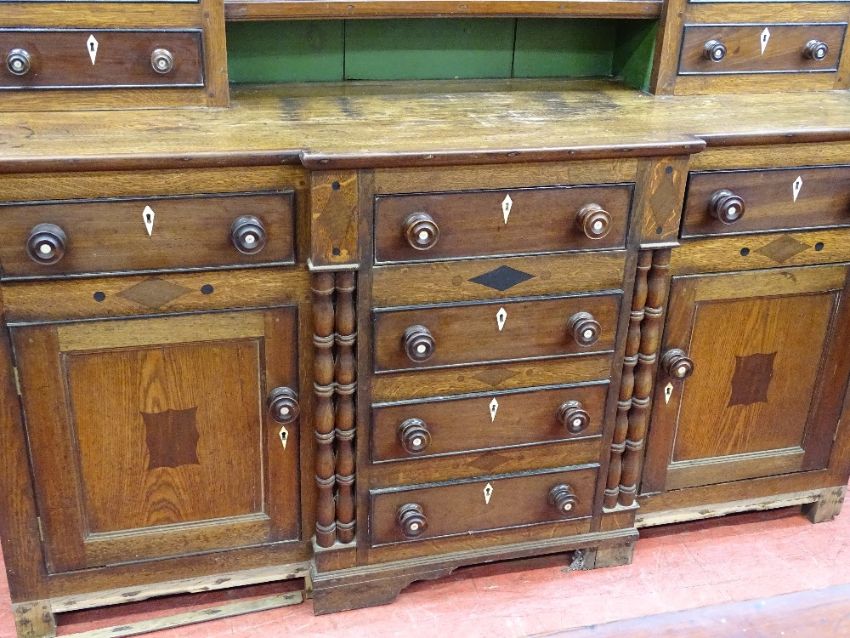 A 19th CENTURY ANGLESEY OAK & PINE BREAKFRONT DRESSER with three over three 'T' arrangement drawers and flanking cupboards, the rack semi-glazed with three open concave shelves and base drawers, 183 cms wide, 222 cms high, 54 cms wide