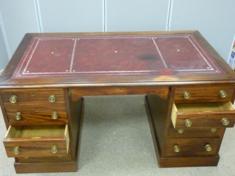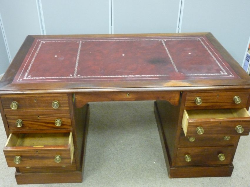 A CIRCA 1900 TWIN PEDESTAL DESK with excellent blood red tooled leather effect top, 145 cms wide, 82 cms deep