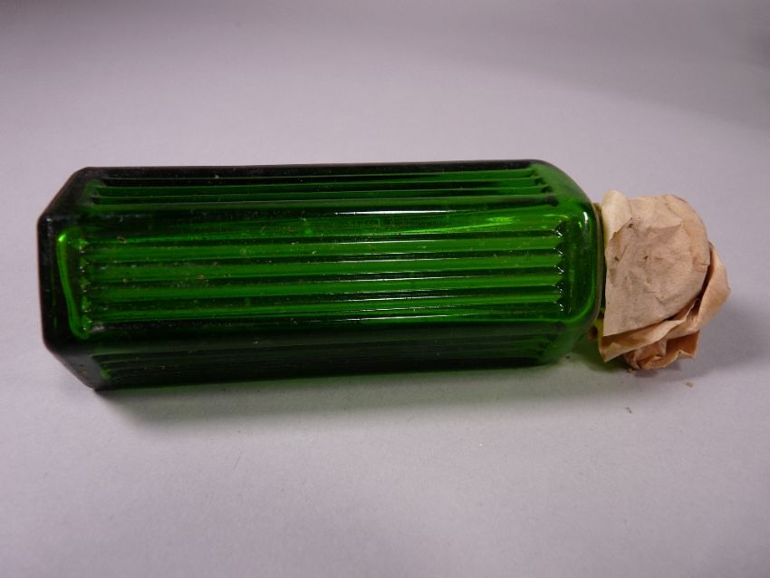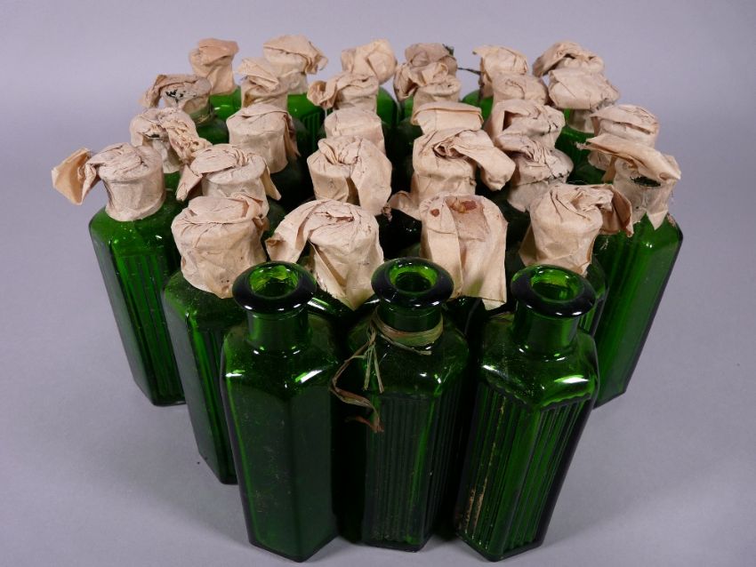 APOTHECARY BOTTLES - Thirty one green glass hexagonal ribbed bottles, most with original paper seals, 11 cms high