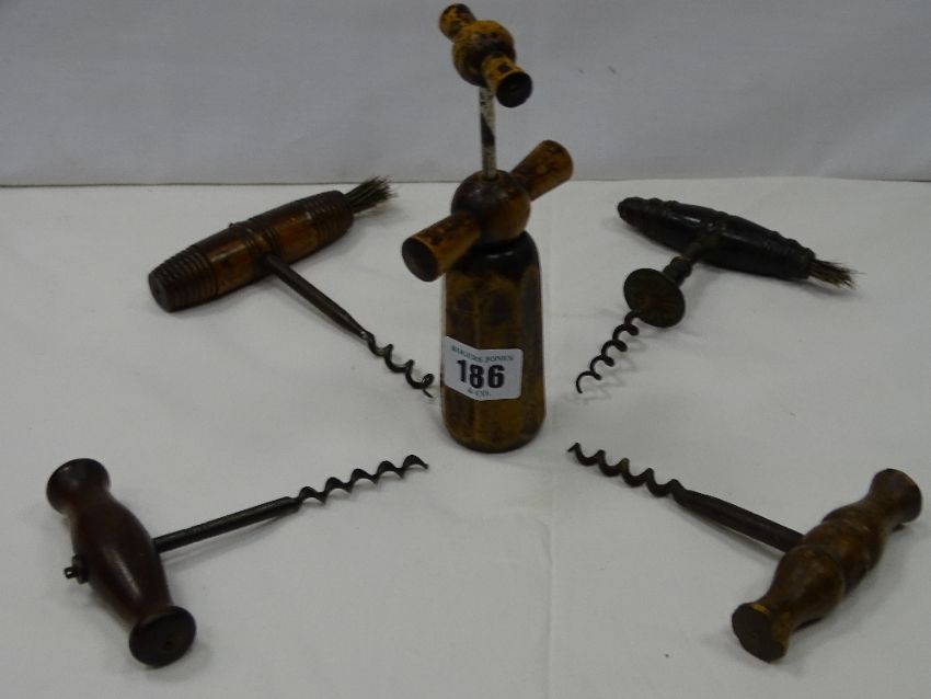Five vintage and antique wooden handled corkscrews