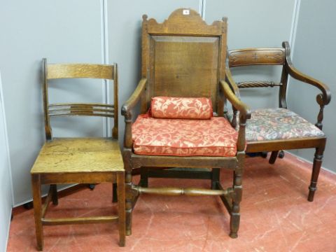 An early 19th Century panel back oak armchair, peg joint construction with later upholstered seat pad, a similar period oak farmhouse chair and a Regency mahogany armchair