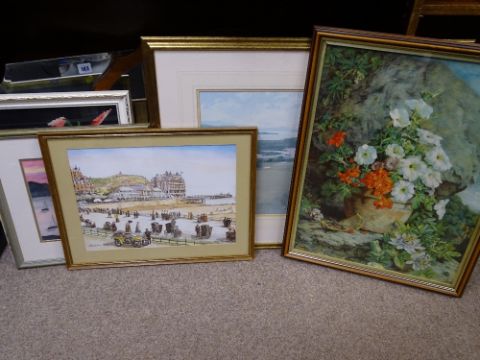 A framed Pears print and other pictures and prints along with two vintage wall mirrors