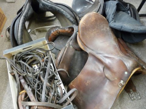 Four various leather horse saddles with a quantity of reins, straps and other tack