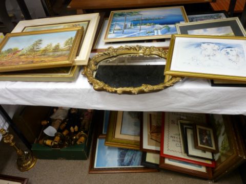 A good mixed collection of framed paintings and prints including limited editions by WARREN WILLIAMS ARCA, EDWARD WALKER, GWYNETH TOMOS, a gilt framed wall mirror and table lamp, a selection of vintage style wall lamps and modern collector's dolls etc (a large selection), proceeds of auction to charity