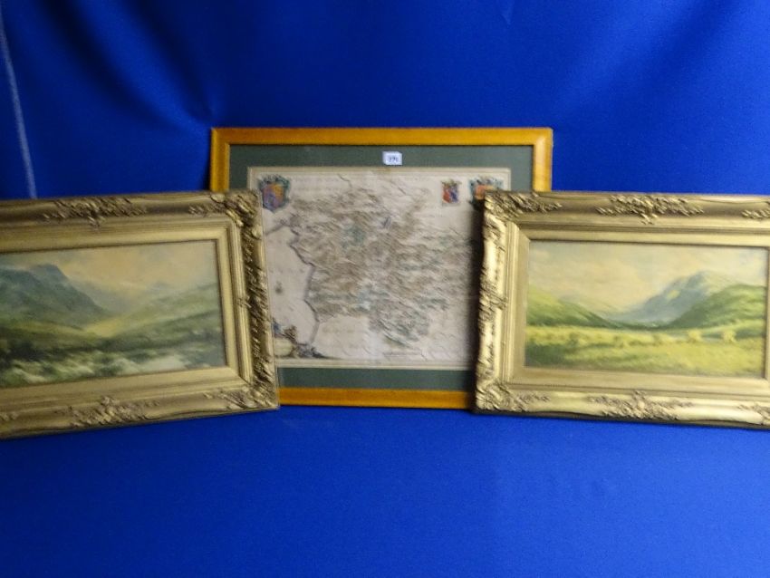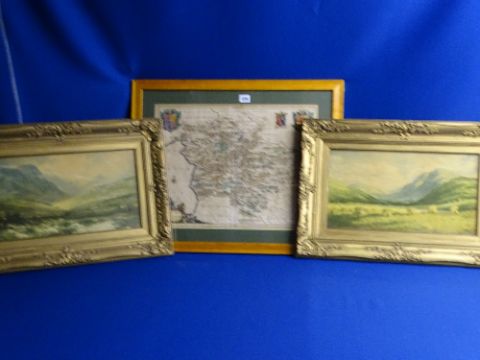 PHILLIP HERBERT colour tinted map - 'Mervinia et Montgomeria' dated 1605, 39 x 50.5 cms and F ROBSON pair of gilt framed prints - mountain scenes with stooked corn and a rocky river to the foreground, 23 x 43 cms