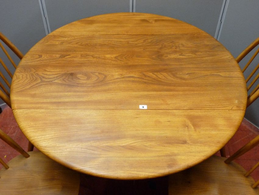Ercol drop leaf dining table, 73 cms high, 130 cms wide, 64 cms deep (closed) and four high backed chairs