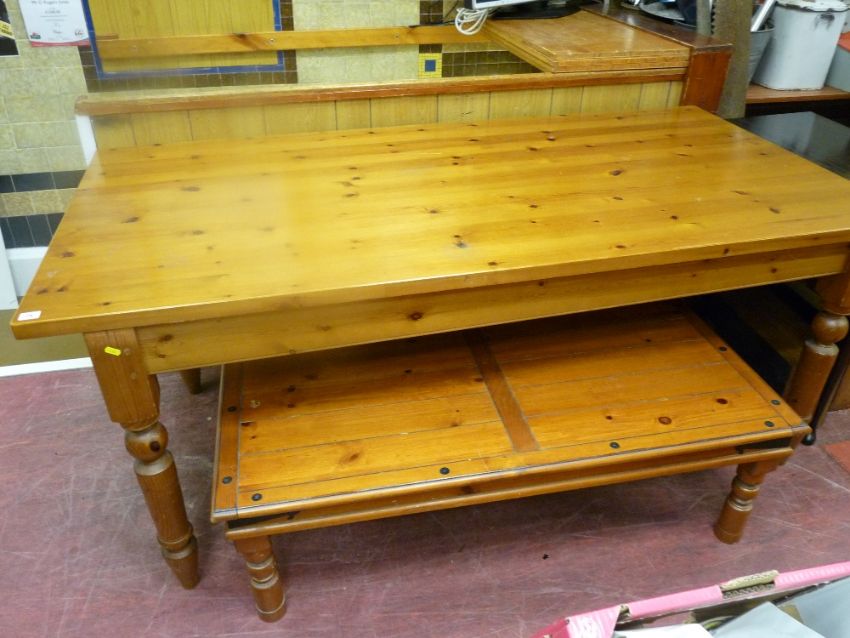 Victorian style reproduction pine kitchen table on turned supports, 77 cms high, 181 cms wide, 92 cms deep with a modern Mexican type pine coffee table, 41 cms high, 125 cms wide, 61 cms deep