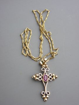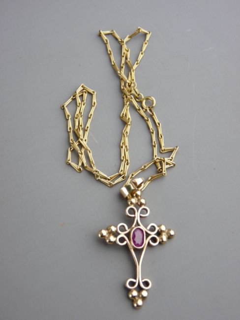 Large nine carat gold crucifix pendant with centre oval blue stone and good link chain, total 9.3 grms