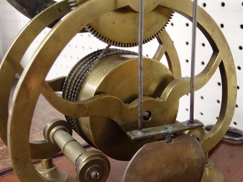 Antique six pillar brass skeleton clock, single fusee movement and silvered chapter ring set with Roman numerals under a glass dome on an oval mahogany base with brass plaque, marked 'Armstrong, Manchester', with key and pendulum, 28 cms high the clock, 33 cms high overall, 28.5 cms wide maximum
