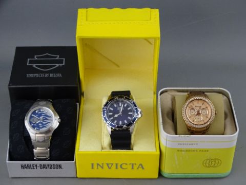 Three boxed designer gent's watches - Fossil, Invicta & Harley Davidson