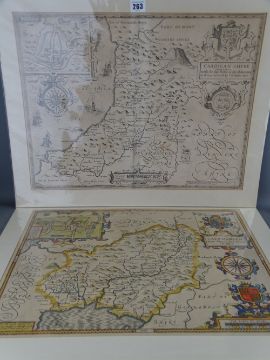 JOHN SPEED two 17th Century unframed maps - 'Caermarden', hand coloured and 'Cardigan Shyre', uncoloured, sellers Bassett & Chiswell, 39 x 51 cms and 39 x 52 cms respectively