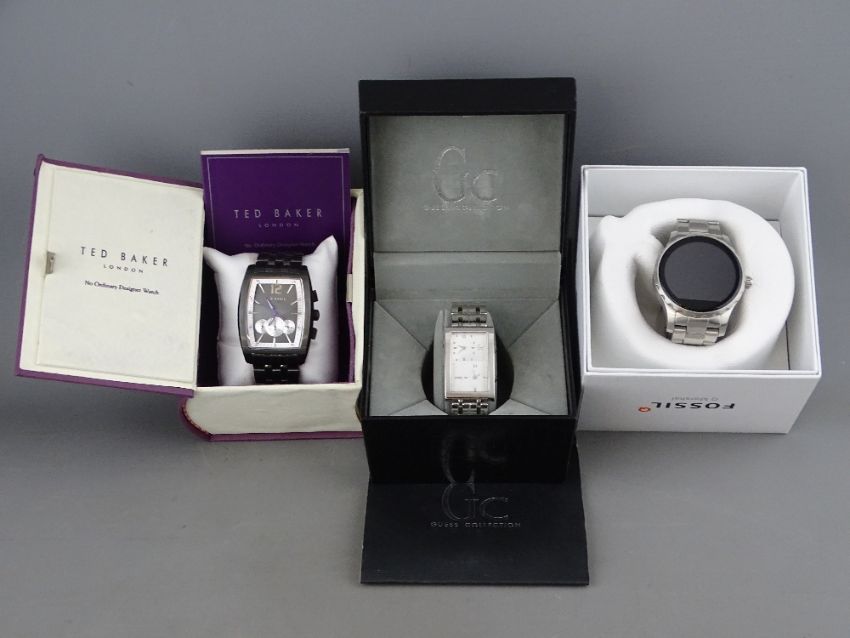 Three boxed designer gent's watches - Guess, Ted Baker & Fossil