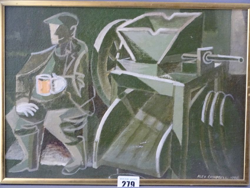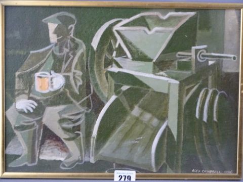 ALEX CAMPBELL acrylic on canvas - titled 'Cider Maker', signed and dated 1986, 25 x 35 cms