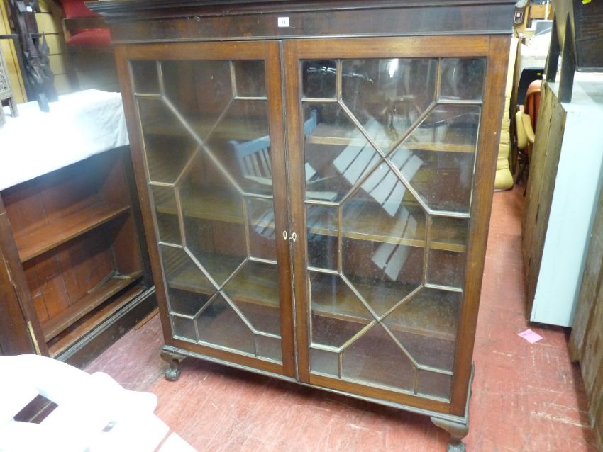 Circa 1900 glass front mahogany bookcase having twin thirteen pane astragal glazed doors and adjustable interior shelves, on ball and claw corner supports, 147 cms high, 125.5 cms wide, 37.5 cms deep maximum (one glass pane cracked)