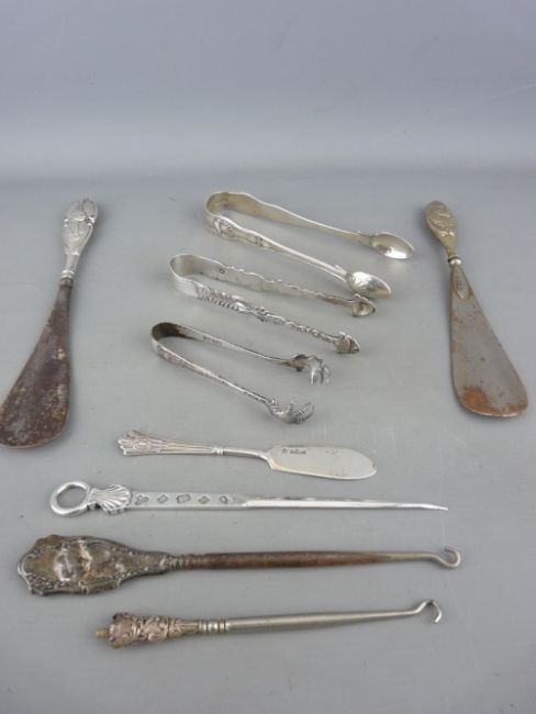 Selection of silver sugar tongs and other items including a skewer/letter opener, various assay marks, dates include Sheffield 1892 to London 1977, 4.9 troy ozs weighable