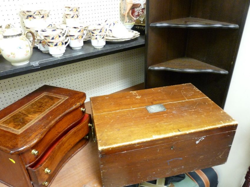 Mappin & Webb lidded box with white metal presentation plaque, a mixed woods jewellery chest with lift-up lid and a reproduction four shelf hanging corner wall display rack