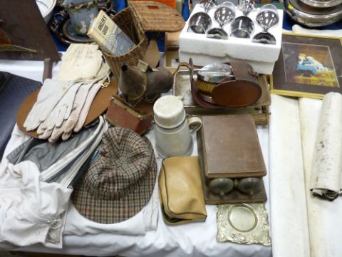 Vintage beekeeper's outfit, a fishing creel, a book, a pair of silver clothes brushes in leather case, a boxed sheep marker set etc