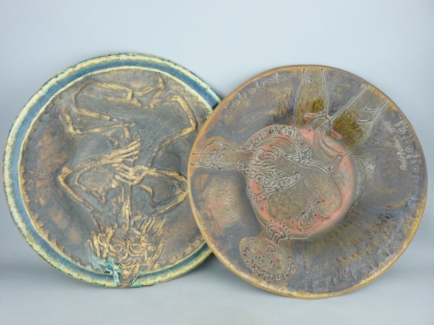 Two Peter Askem pottery chargers, 41 cms diameters approximately, incised signatures dated 1967