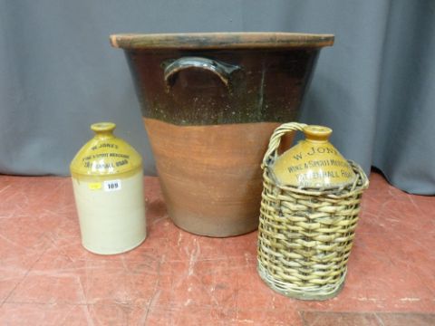 Two stoneware W Jones, Wine & Spirit Merchant flagons and a vintage pottery egg crock