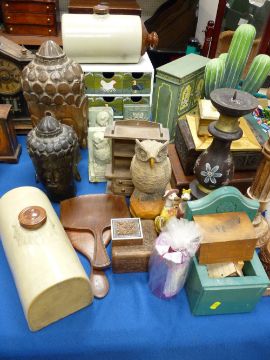 Collection of vintage mainly treen boxes, storage containers and carvings, two sets of composition bookends and two stoneware hot water bottles etc