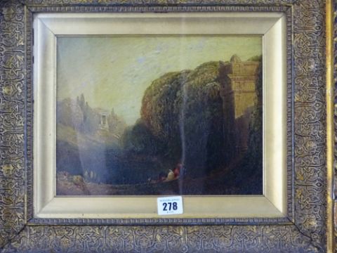 CONTINENTAL SCHOOL oil on board - figures resting before a lake amongst overgrown ruins, no visible signature, 19th Century, 20 x 26.5 cms