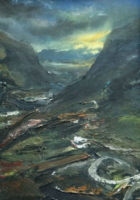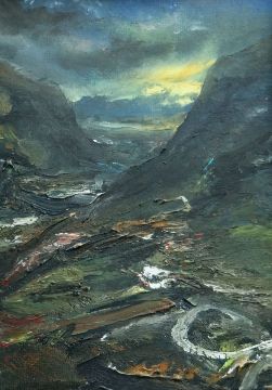 IWAN GWYN PARRY oil on canvas - entitled verso 'Stormy Sunset Over the Nant Ffrancon Valley' on Martin Tinney Gallery label, 18 x 12cms