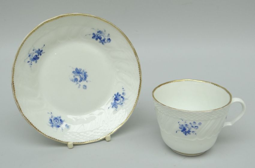 A SWANSEA PORCELAIN CUP & SAUCER with moulded basket-weave border, swirl moulded border, dentil gilt rim and a series of blue painted sprays